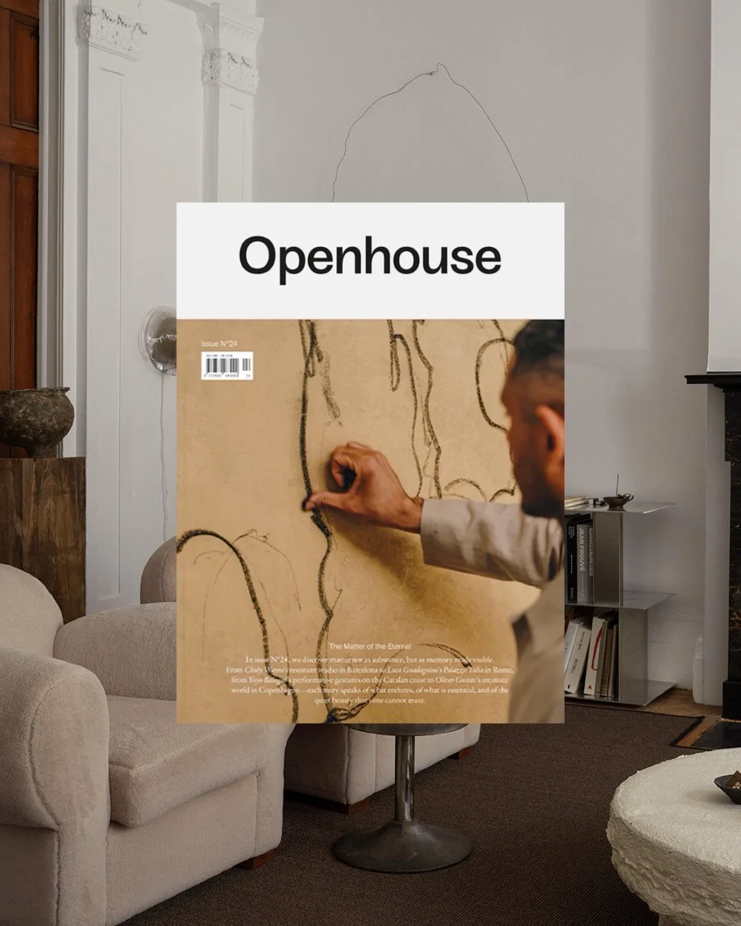 Interior space featuring a modern artwork on the wall, a dome-shaped lamp on a wooden box, a sleek black speaker, and a wooden chair with leather accents.